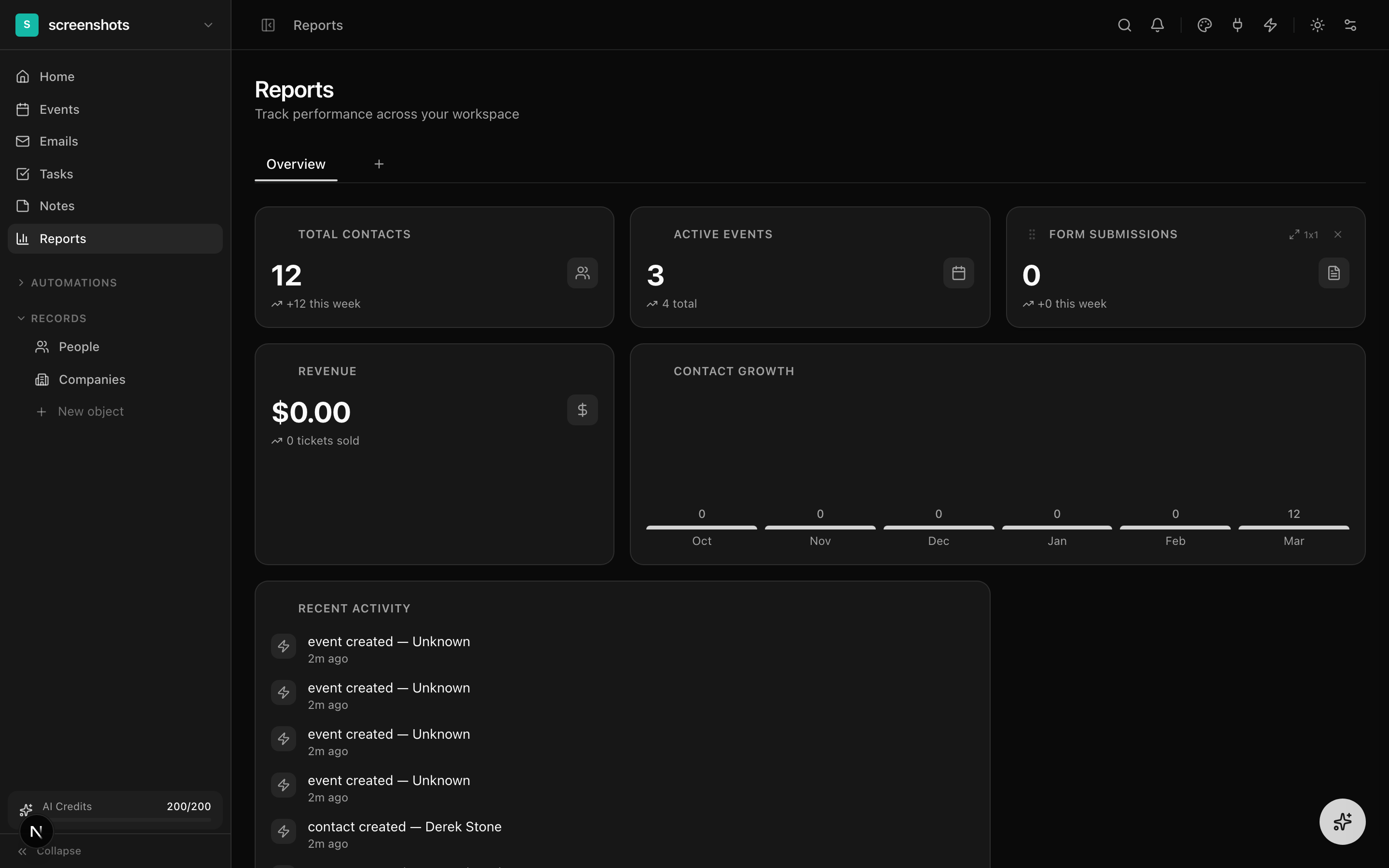 The reports dashboard supports multiple widget types: stat cards, bar charts, line charts, recent activity, top events, and contact growth. Resize widgets by cycling through small, medium, and large sizes.
