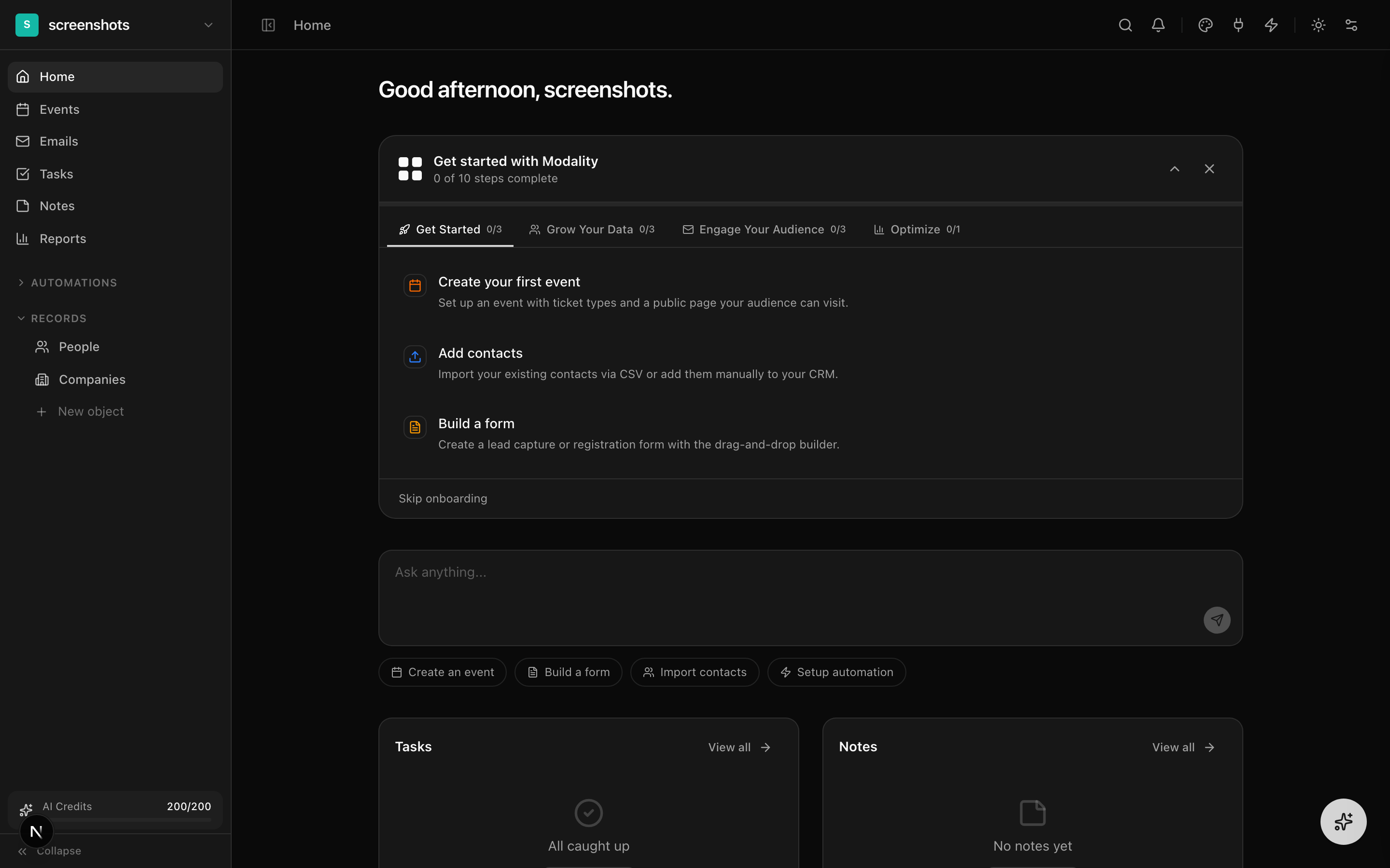 Modality is an AI-native CRM platform for events, campaigns, and creative teams. This guide covers every feature in detail to help you get the most out of the platform.