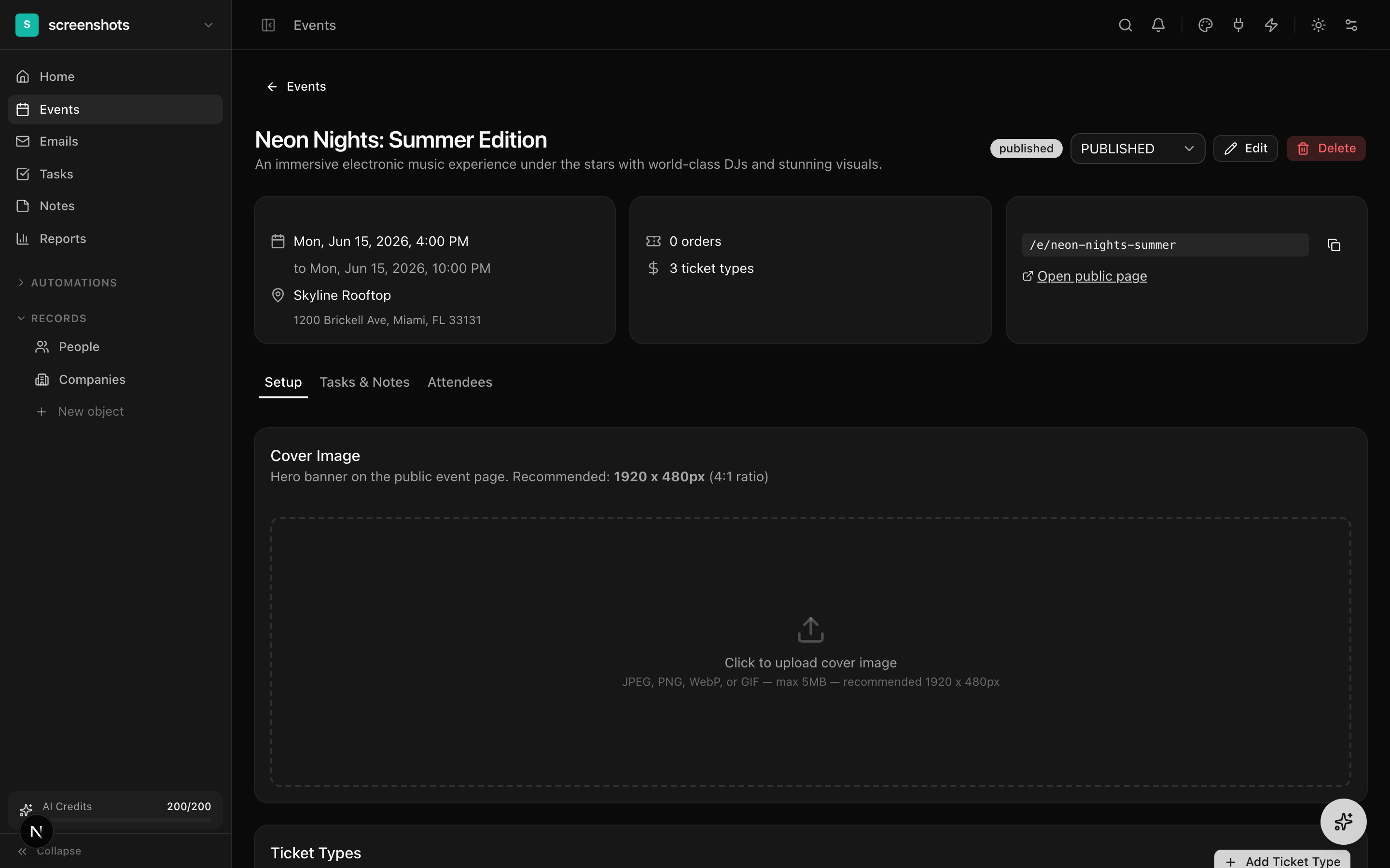 Set up ticket types, customize your public page, and start selling tickets.
