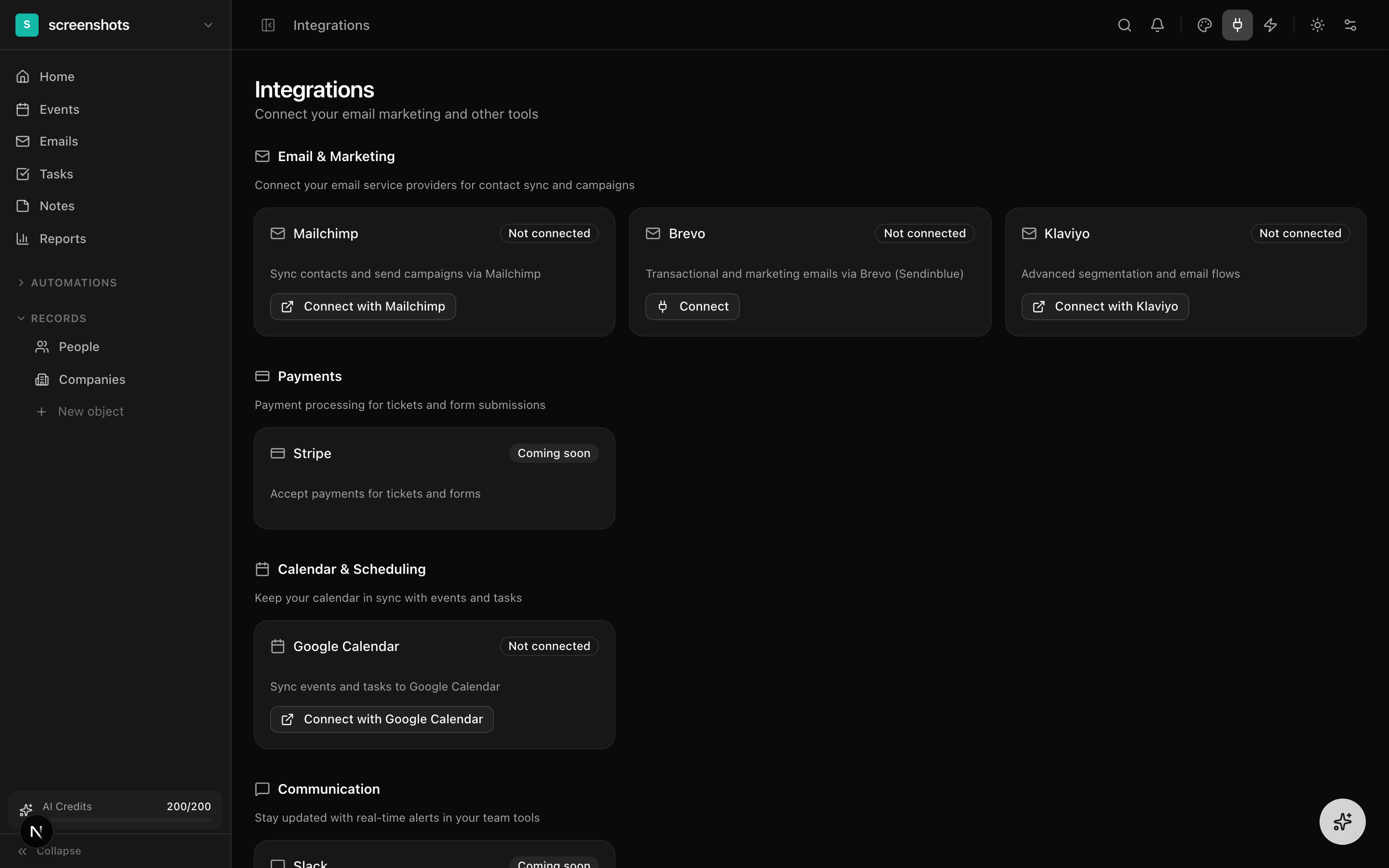 AI features are powered by credits. Each plan includes a monthly credit allocation. Credits are consumed when you use the AI assistant to create events, forms, manage contacts, or run workspace commands. Usage is tracked in Settings → Billing.